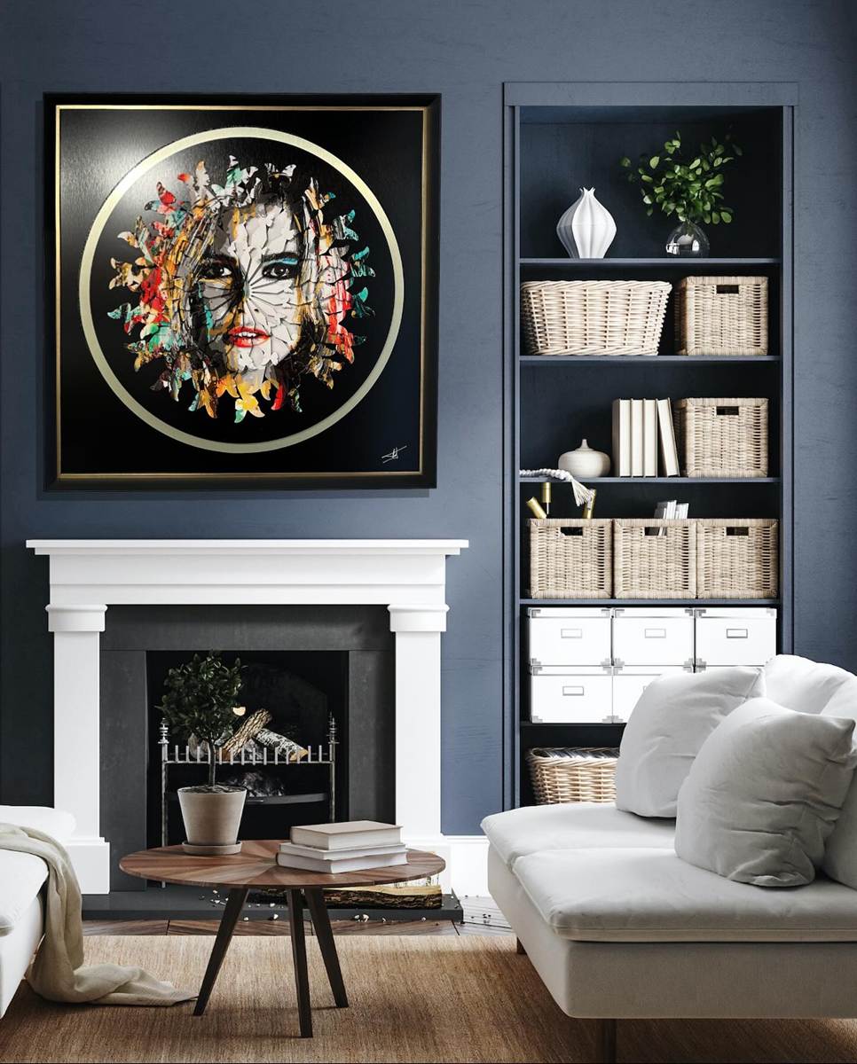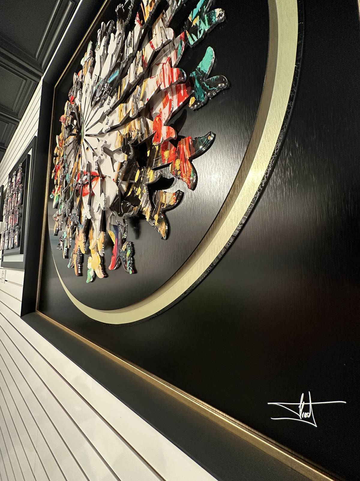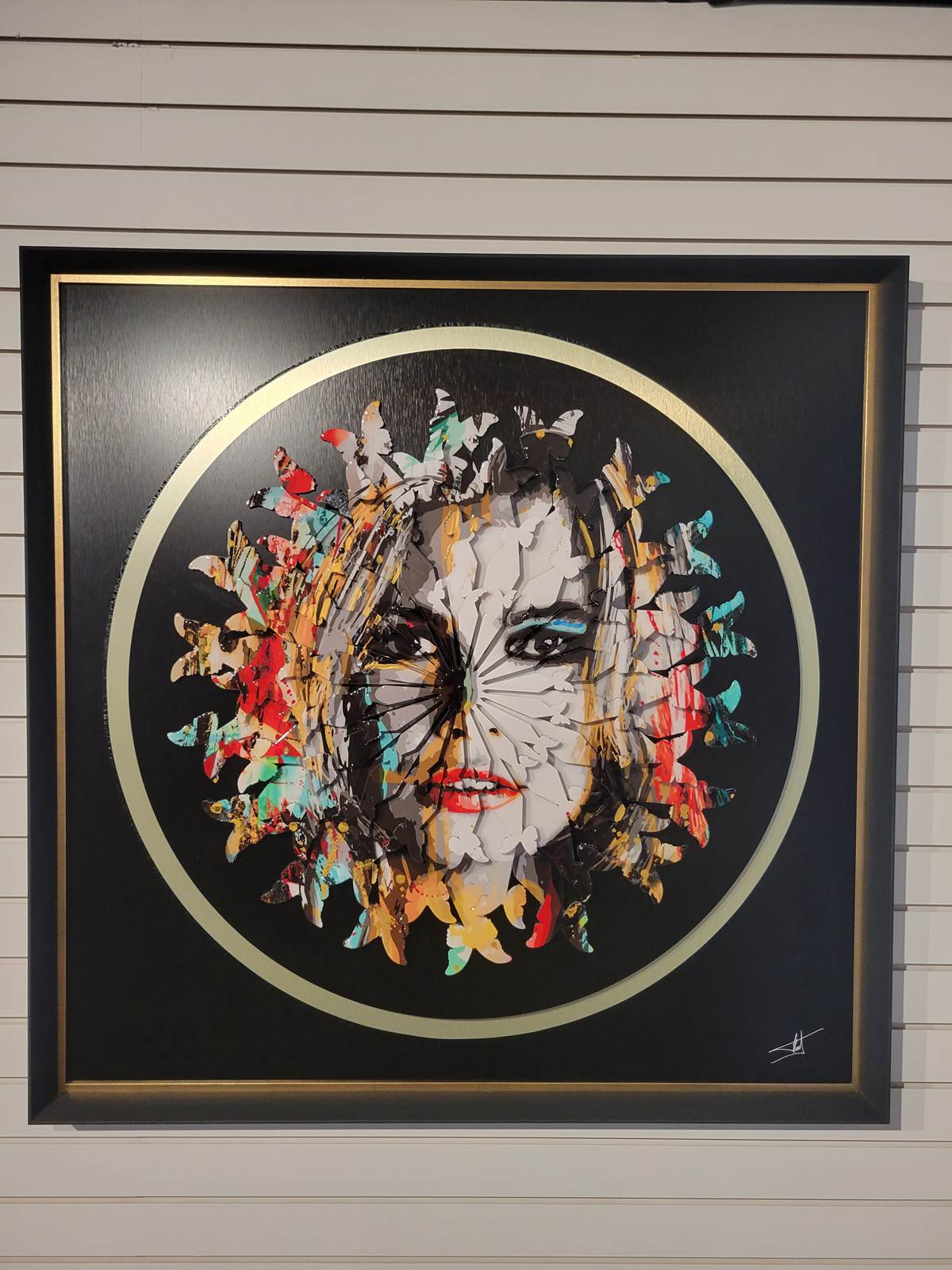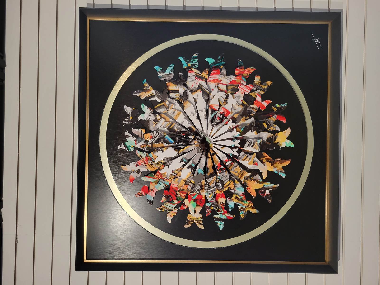The work created by Fred Meurice is entitled “Girl in butterflies” and is made using the plexiglass technique.