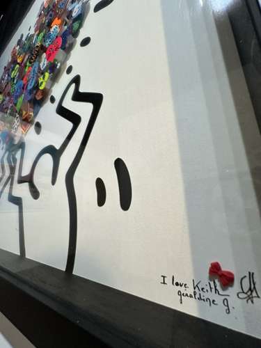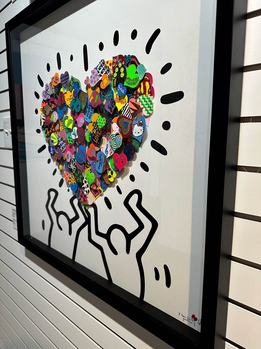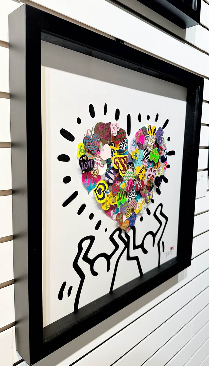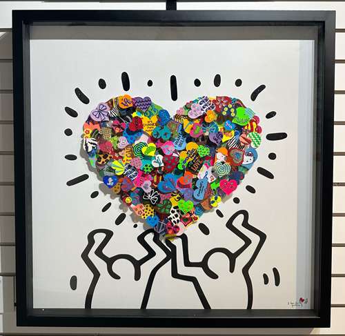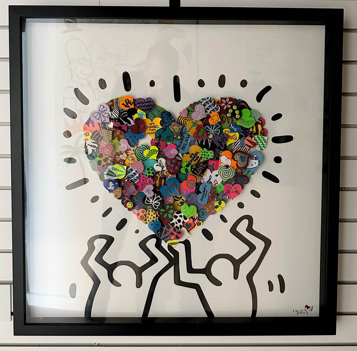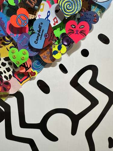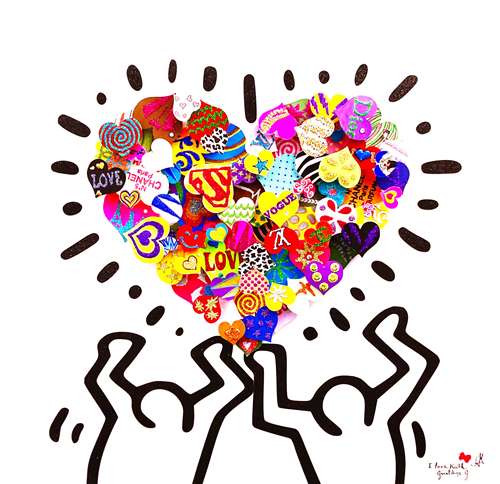 Small hearts assembled in the shape of a heart held by 2 Keith Haring characters.