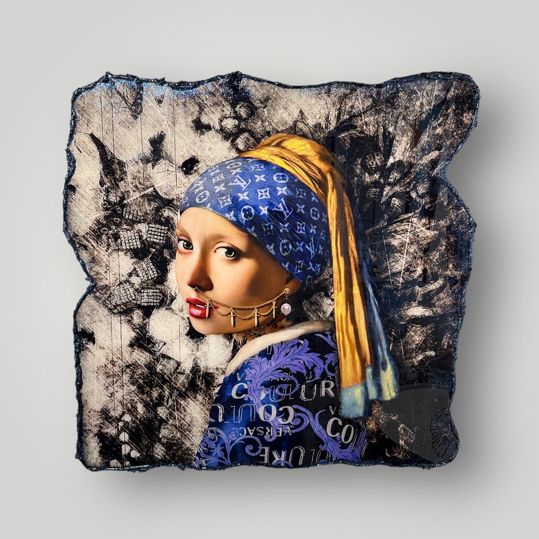 Pearl Girl, is an amazing new masterpiece of humor, icons, and pop-art combined. The asymmetrical borders covered in sparkles create a stunning effect combined with the glass-like acrylic which has been layered over the image to create a 3D like depth.