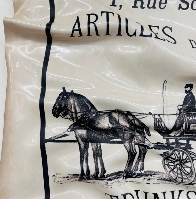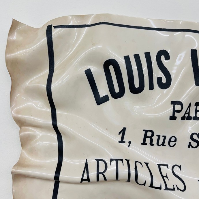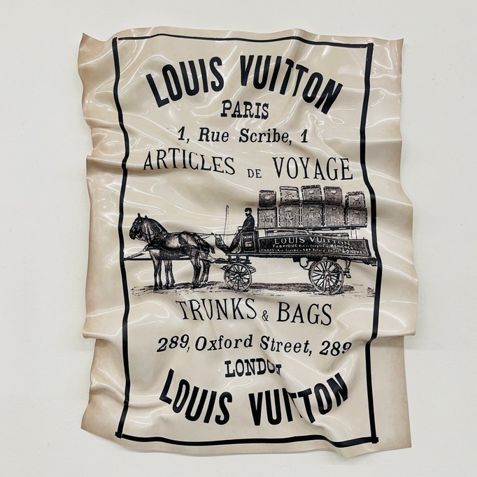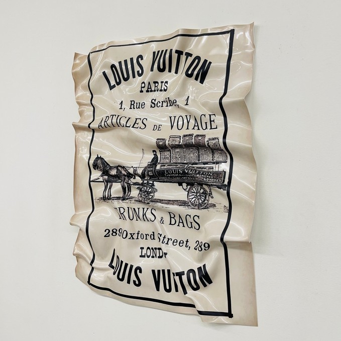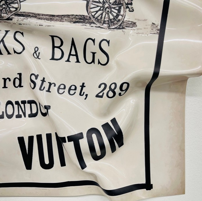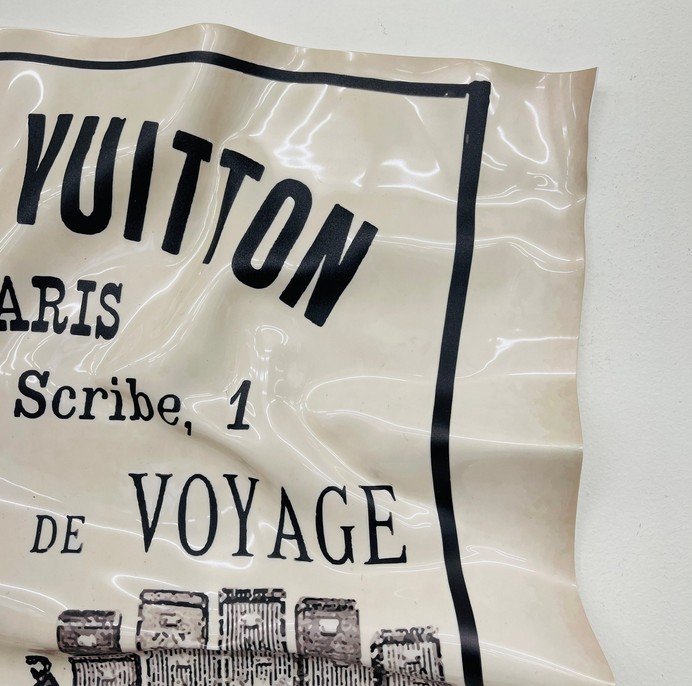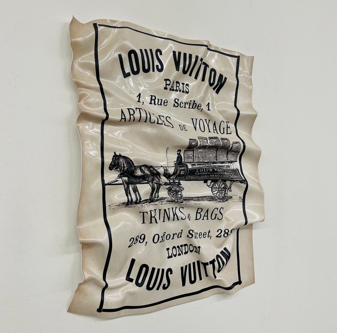 At first glance, the piece appears to be a delicate, folded textile or a weathered vintage poster. In reality, it is a sophisticated resin sculpture. Using his revolutionary “Reality Concept,” Soyz Bank transforms the medium to mimic the soft folds and ripples of fabric. At the heart of the artwork lies the nostalgic representation of a horse-drawn carriage—the eternal symbol of the House of Louis Vuitton—reminding us of the brand’s origins and its timeless contribution to the art of travel and elegance.